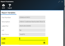 - When printing the Part Form/Report, the Parameter(s) will show up within a pop-up screen. NOTE: Parameters can be made to be required for entry.