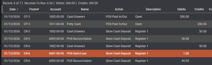 In this example, a paid-in posting was done for 200.00. Next, two POS reconciliations were performed: one for 50.00 with no gain/loss, and another for 49.00 with a dollar loss to ensure the gain/loss account is used correctly.